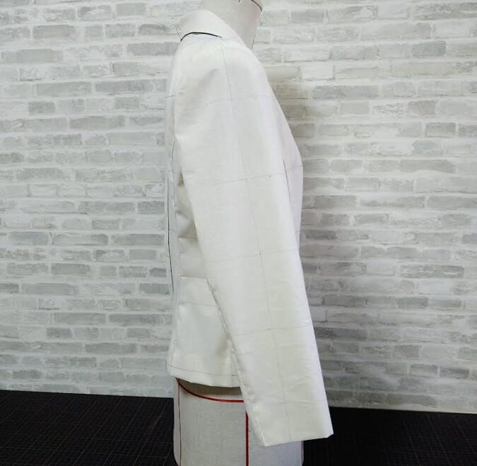 例えばラペルの返り線を直線ではなく柔らかいカーブにするために返り線の奥にダーツを取っています。