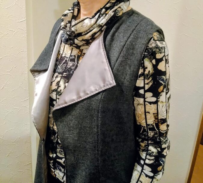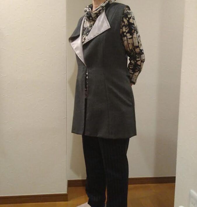 以前制作したオフタートルネックのプルオーバーとロングジレを合わせています。